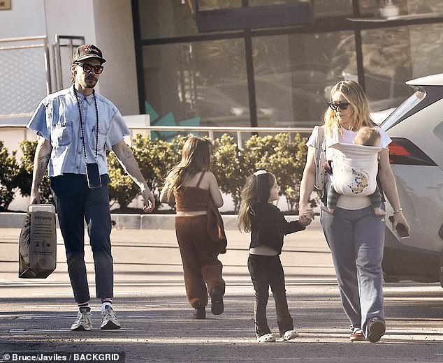 Hilary kept things casual in grey sweatpants and a white t-shirt while wearing Townes on her chest and holding hands with Mae.