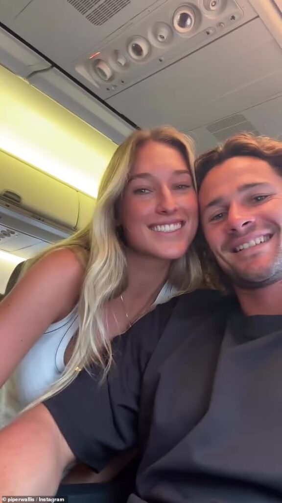 Cronulla Sharks NRL star Nicho Hynes and his new girlfriend Piper Wallis were all smiles on the plane as they dashed off for a weekend getaway