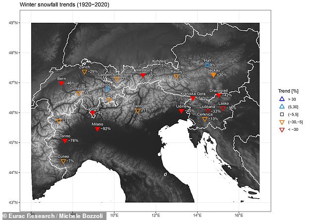 Mr Bozoli says: ‘The most negative trends concern locations below an altitude of 2,000 meters and are in the southern regions such as Italy, Slovenia and part of the Austrian Alps.’