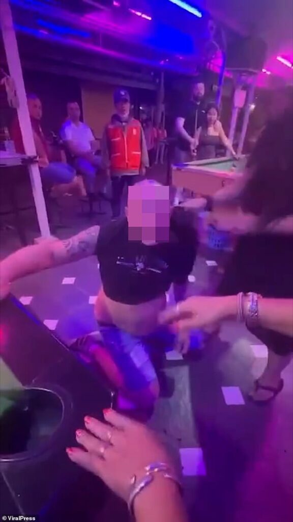 This is the shocking moment a group of furious female workers beat up a British tourist at a Thai bar with their high heels before kicking him out.