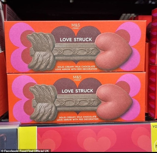 British retailer M&S has just released a brand new range of amorous chocolates – a selection which has left innuendo loving social media users hysterics (Love Struck chocolate arrow pictured)