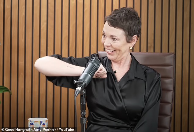 Olivia has said that the actress inked ‘the initials of my loved ones’ on her left arm using a stick-and-poke tattoo kit (pictured together in The Lost Daughter)