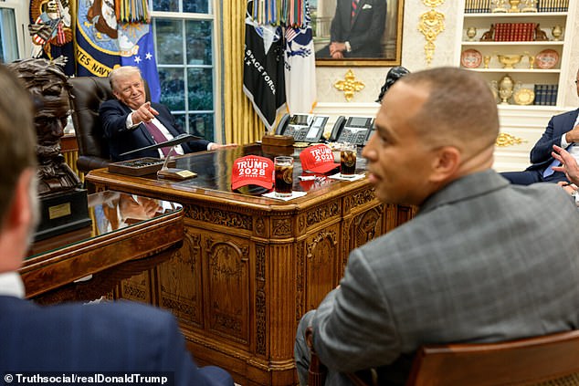 Jeffries even asked JD Vance, who was in the room at the time, what he thought of the president running for a third term, to which the vice president said: ‘No comment.’