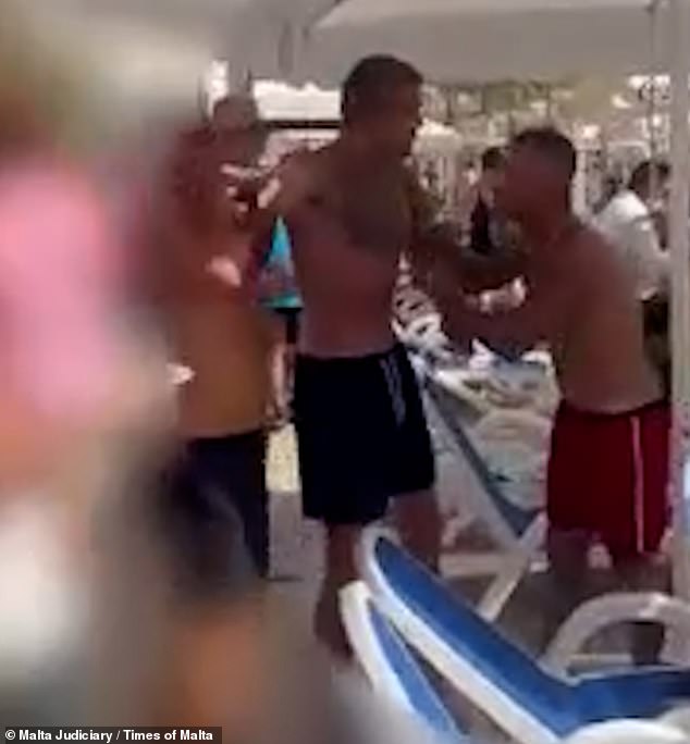 This is the shocking moment a British tourist brawled with locals at a Maltese hotel after seeing them pulling a woman by the hair and dangling a baby upside down.