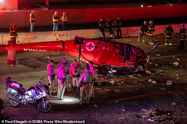 The debris from the red helicopter – flipped upside down – is seen scattered across several lanes.