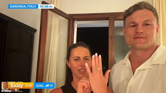 Appearing on Channel Nine’s Today on Monday morning, the sports presenter and her fiancé were beaming as they dialled in from Italy.