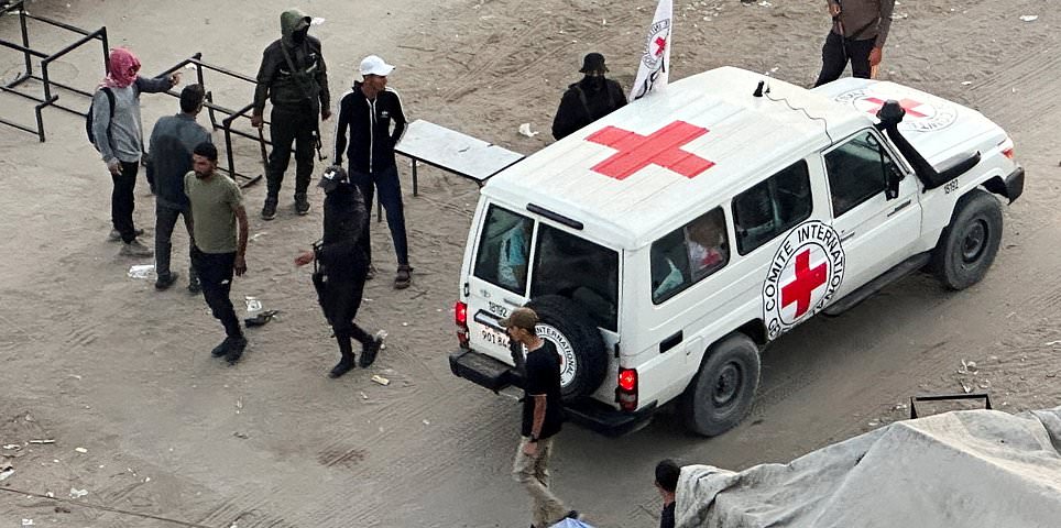 Pictures show a Red Cross vehicle driving through Gaza to an Israeli-controlled territory.