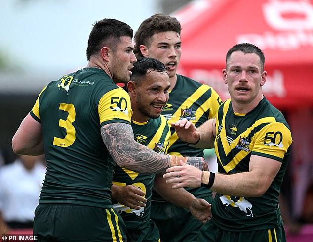 A child was struck by a security vehicle following Australia’s Prime Minister’s XIII team’s win against Papua New Guinea in Port Moresby (pictured, Australian players during the match)
