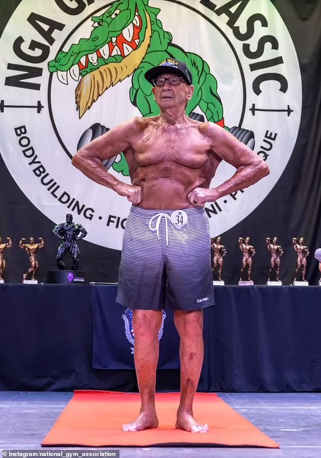 Andrew Bostinto, 100, is pictured above on May 10 this year on stage for the National Gym Association’s Gator Classic, a natural bodybuilding and physique competition, in Florida