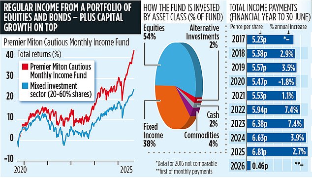 It’s called Premier Miton Cautious Monthly Income, a £227 million fund which, through investing in a mix of equities and bonds, provides an annual income equivalent to a tad above 5 per cent.