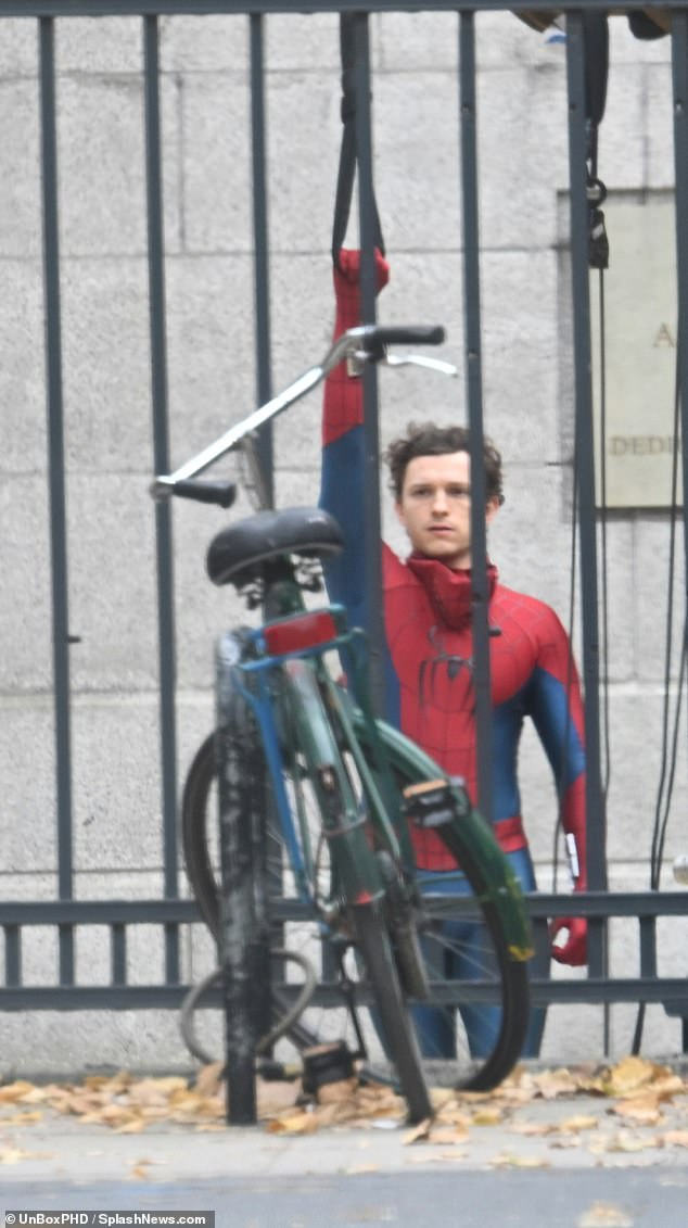 Tom Holland was spotted filming intense Spider-Man scenes on Sunday as he took to the streets wearing his iconic costume