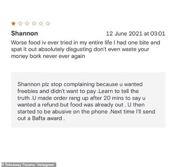 Another says: ‘Shannon, please stop complaining because you want freebies and didn’t want to pay. Learn to tell the truth. You made order, rang up 20 minutes after to say you wanted a refund but the food was already no the way. You then started to get abusive on the phone. Next time I’ll send out a Bafta award’.
